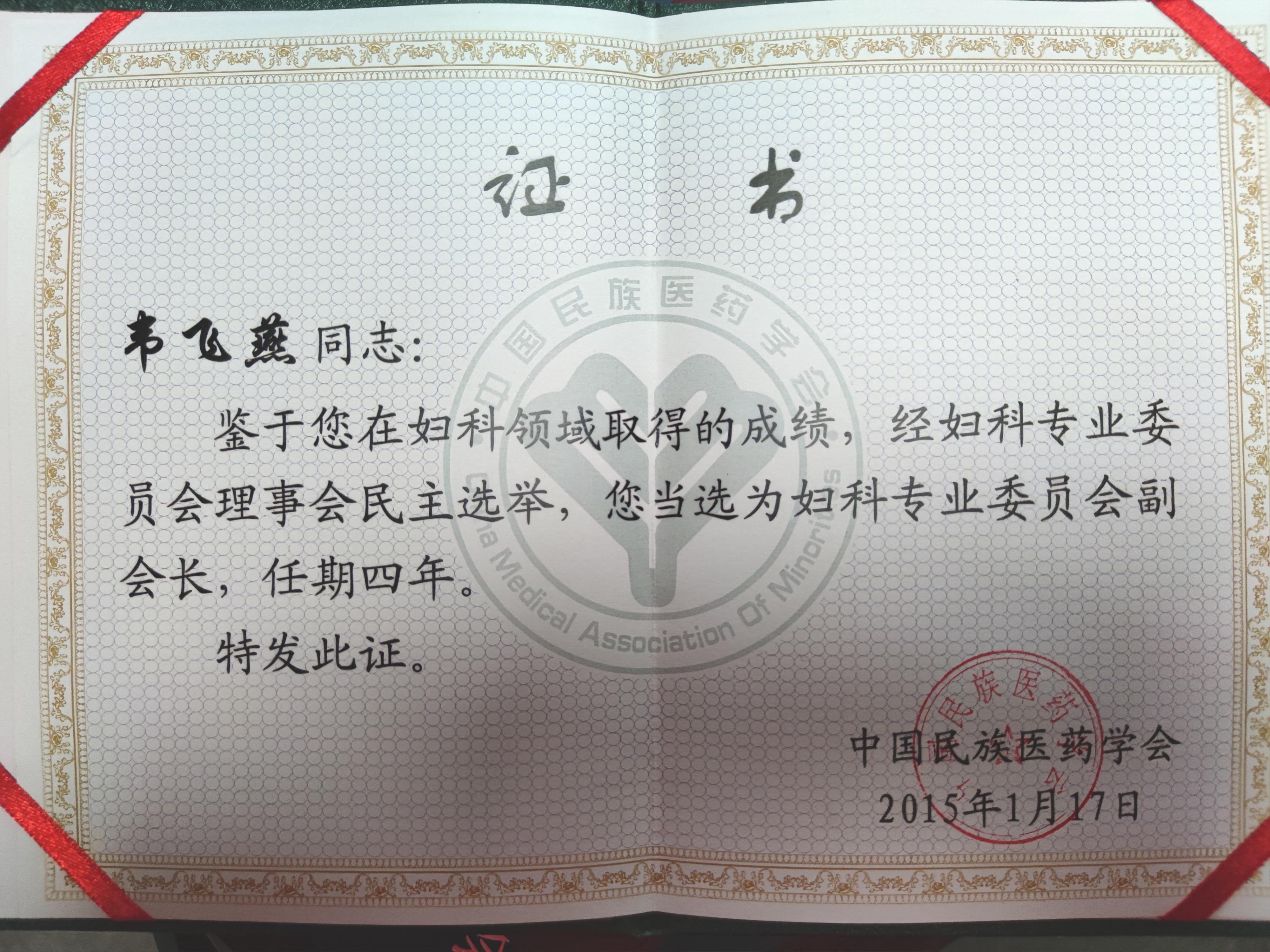2015/01:韦飞燕董事长当选中国民族医药学会妇科专业委员会副会长职务。