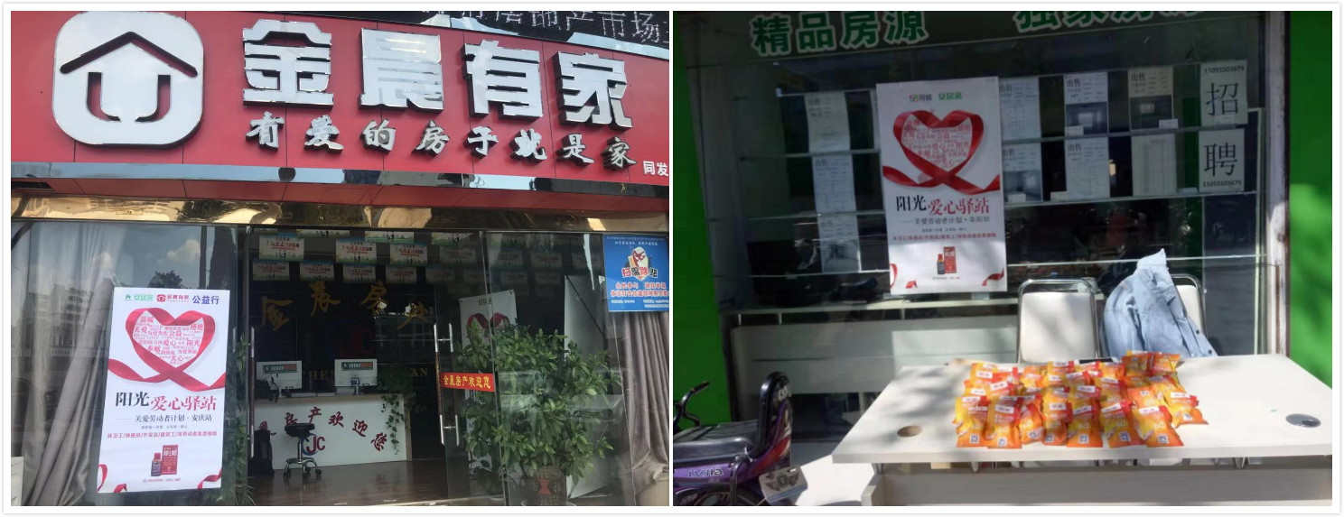 联合房产经纪公司门店设立阳光爱心驿站,为环卫工、建筑工、快递员、外卖员等城市劳动者免费提供休憩场所和爱心礼品,劳动者可进店休息, 免费领取花红药业消肿止痛酊、瓶装水等爱心礼品,通过力所能及的小小善举,给奔波劳作的劳动者献上一份支持和关怀。
